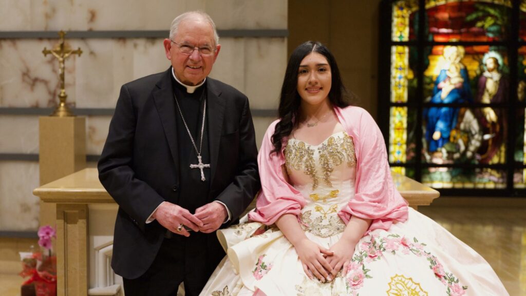 Salma Parra, de 16 años, feligresa de la parroquia San Juan María Vianney en Hacienda Heights y ganadora del concurso de canto de las Mañanitas, posa con el arzobispo José H. Gomez durante el evento por Nuestra Señora de Guadalupe el 11 de diciembre en la Catedral de Nuestra Señora de los Ángeles. (Reese Cuevas)
