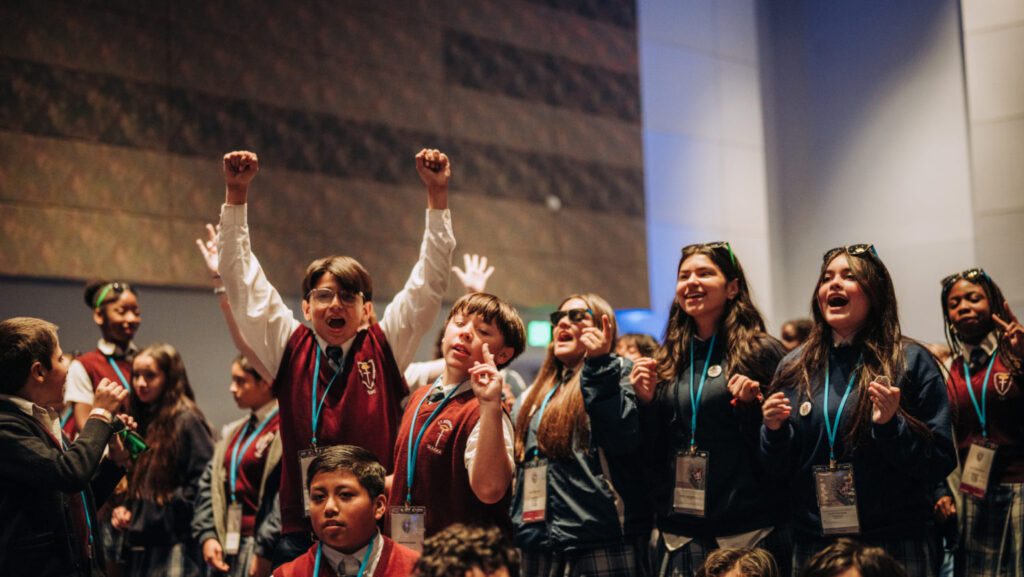 Al comenzar la jornada para los estudiantes de escuela intermedia, hubo mucho baile. El conferencista y artista católico Joe Melendrez animó a los jóvenes con cánticos de llamada y respuesta —“¡No hay fiesta como una fiesta de Jesús!”—, coreografías proyectadas en pantallas y juegos interactivos que hicieron que los chicos corrieran, hicieran amigos, chocaran las manos y bailaran sobre las sillas.