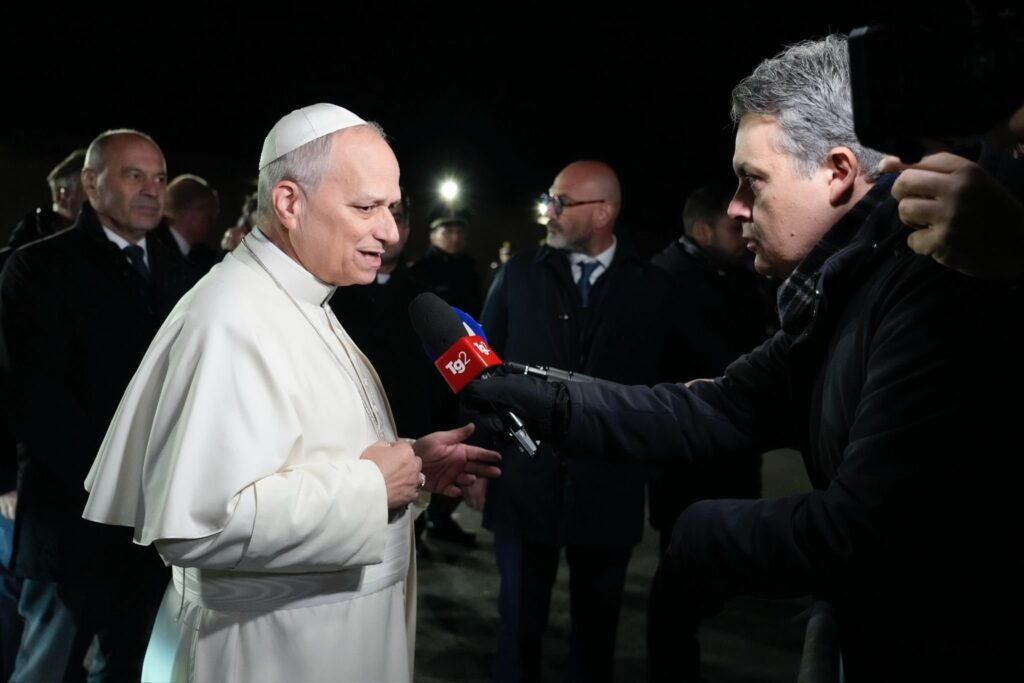 El Papa León XVI habla con periodistas antes de dejar la residencia papal en Castel Gandolfo, Italia, el 24 de marzo de 2026, para regresar al Vaticano. "Quiero renovar mi llamado a un alto el fuego, a trabajar por la paz --no mediante las armas, sino a través del diálogo-- y a buscar verdaderamente una solución para todos", dijo a los periodistas. "hay más de un millón de personas desplazadas y muchas han perdido la vida", afirmó el Papa. (Foto OSV News/Catholic Press Photo)