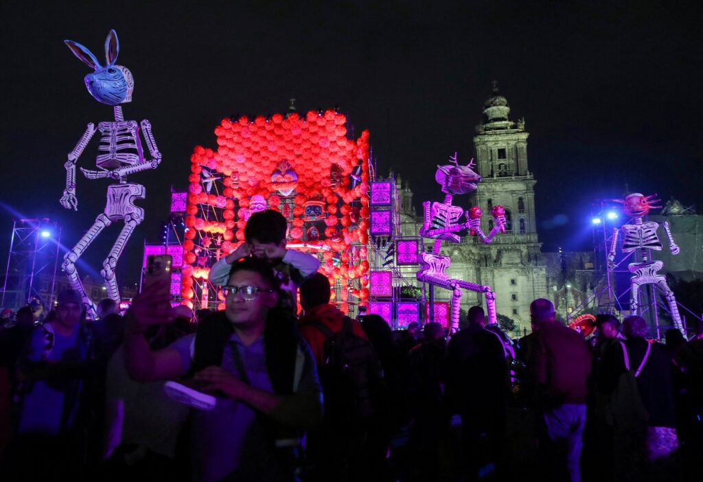 Un hombre se toma una selfie junto a otras personas reunidas cerca de instalaciones artísticas con esqueletos y otras decoraciones en la plaza del Zócalo de Ciudad de México el 30 de octubre de 2024, víspera del Día de Muertos. Al fondo se ve la Catedral Metropolitana. (Foto de OSV News/Henry Romero, Reuters)